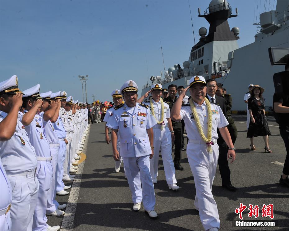 1月9日,中国海军第三十批护航编队抵达柬埔寨西哈努克省西哈努克码头,对该省进行为期4天的友好访问。图为中国海军第三十批护航编队指挥员许海华少将(右)在柬海军云壤基地副司令罗威斯纳少将(左)陪同下检阅。中新社记者 黄耀辉 摄