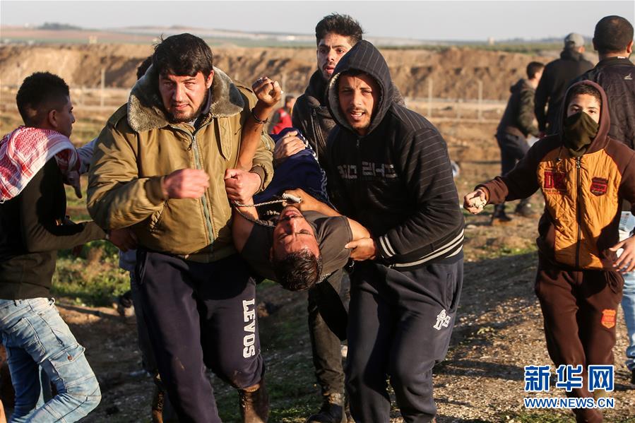 1月11日,在加沙城以东的加沙地带与以色列交界地区,巴勒斯坦人运送一名在冲突中受伤的示威者。