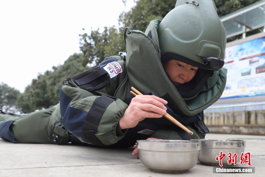 1月14日,搜排爆班班长兼爆破技师邓玉堂用夹黄豆的方式训练注意力和集中力。当日,武警贵州总队某支队工兵中队搜排爆班进行搜排爆训练,武警战士在冬日严寒中身着重达的60余斤的防爆服进行手动搜爆排爆、机器人排爆和手动拆除爆炸装置等课目的演练。中新社记者 瞿宏伦 摄