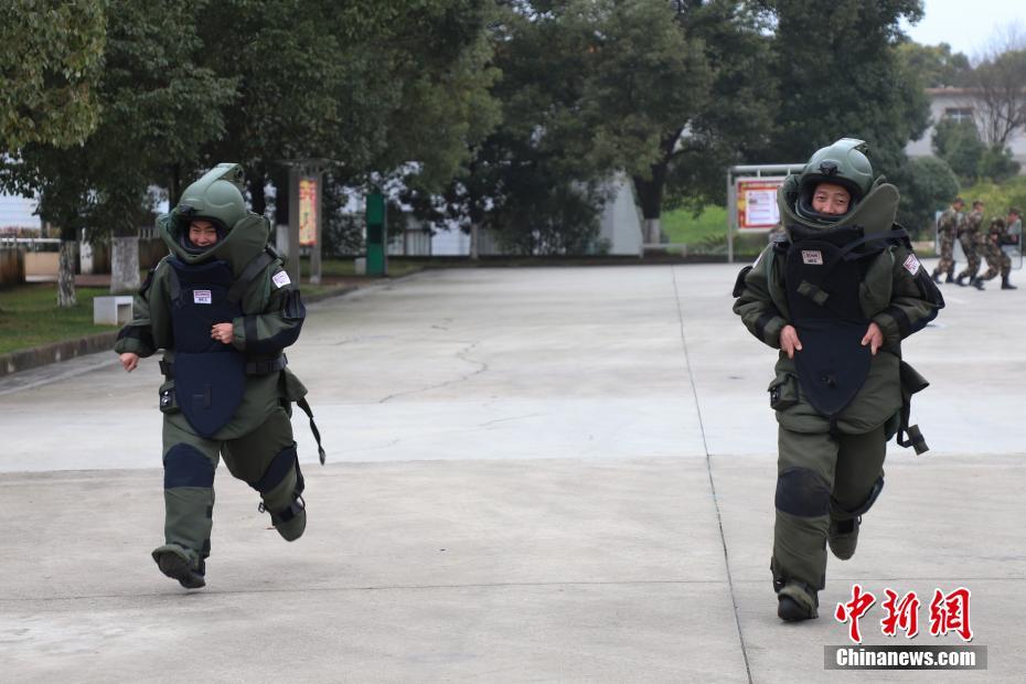 1月14日,李德贵(右)和邓玉堂(左)穿着防爆服进行对抗训练。当日,武警贵州总队某支队工兵中队搜排爆班进行搜排爆训练,武警战士在冬日严寒中身着重达的60余斤的防爆服进行手动搜爆排爆、机器人排爆和手动拆除爆炸装置等课目的演练。中新社记者 瞿宏伦 摄