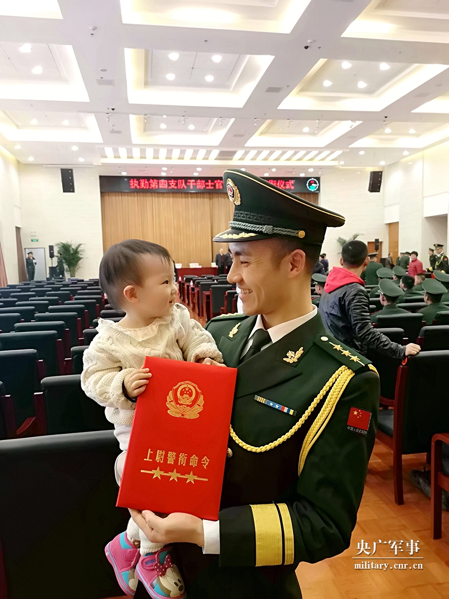 授衔仪式结束后怀抱女儿手拿命令状的武警上尉。姜润邈摄