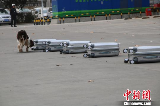 图为警犬检查可疑箱包。 王钊 摄