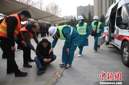图为演练场景之一,乘客受伤,急救人员紧急救援。 王钊 摄