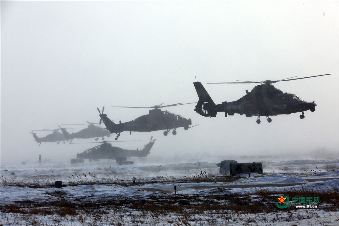 严寒条件下直升机群展开协同训练。吴世科 摄