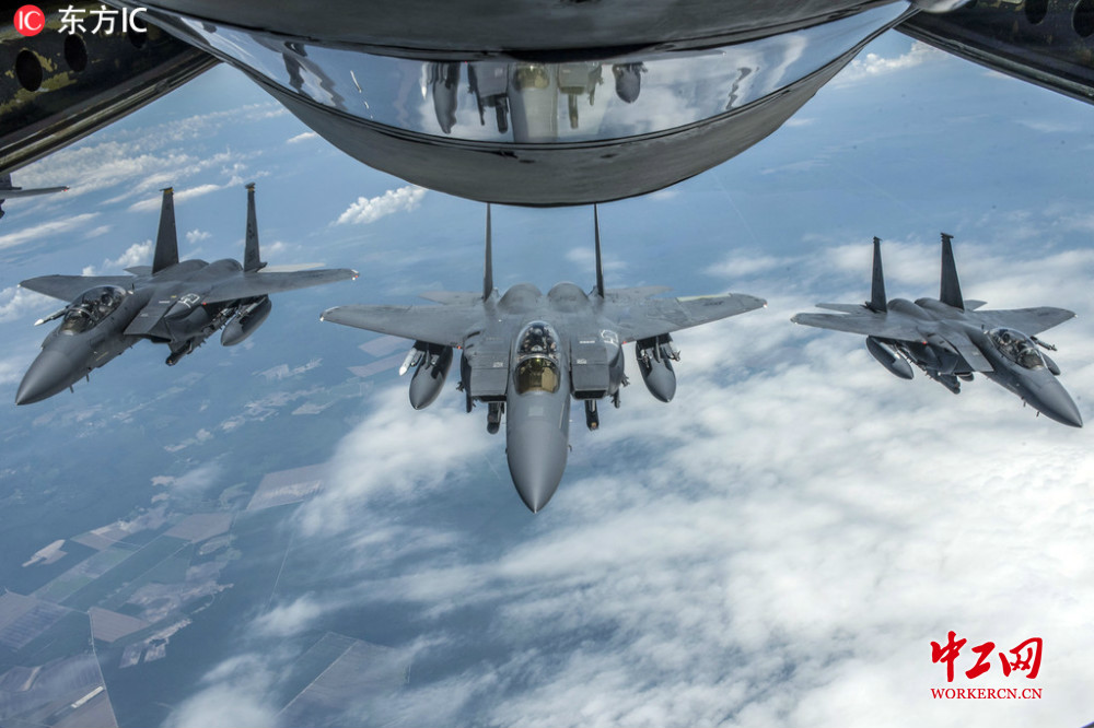 当地时间2018年6月15日, 美国北卡罗来纳州,在西摩·约翰逊空军基地,KC-135同温层加油机刚刚为美国空军第4战斗机联队F-15E攻击鹰战斗机空中加油完毕。