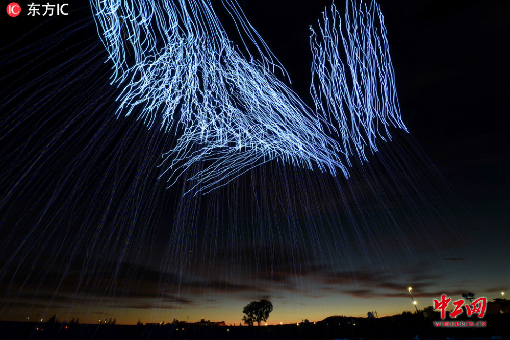 当地时间2018年7月5日,美国加利福尼亚州特拉维斯空军基地,500架无人机进行空中灯光秀。美国空军军士Christian Conrad用延时摄影的办法,拍下了这精彩的瞬间。