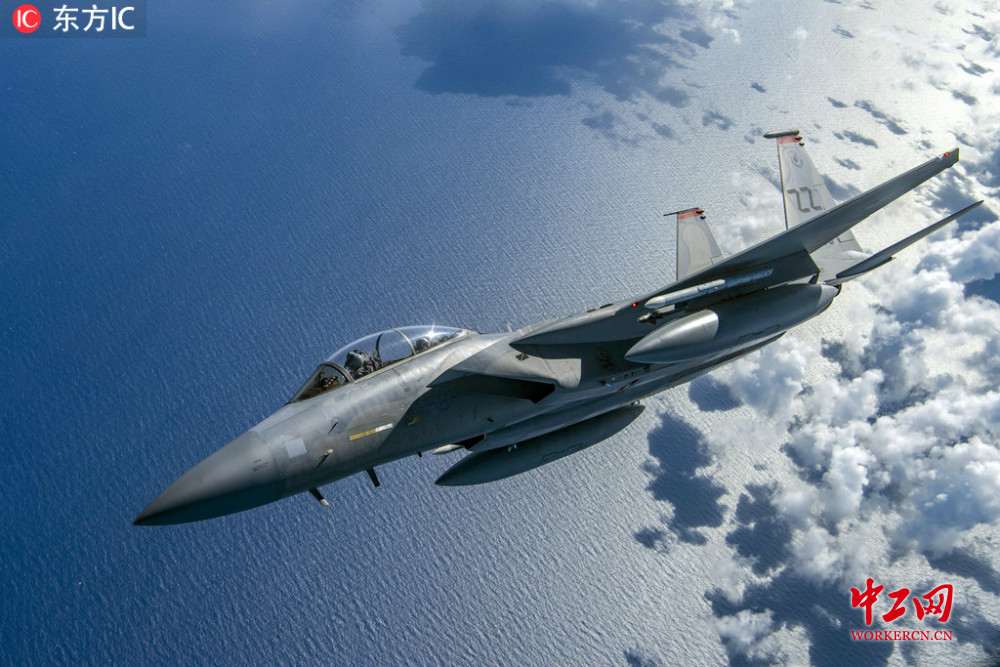 当地时间2018年9月18日,在“勇敢之盾”演习中,一架美国空军F-15D鹰式战斗机在马里亚纳群岛上空飞行。