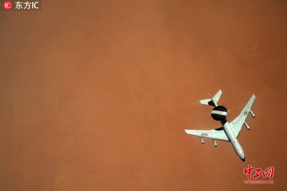 当地时间2018年4月3日,在叙利亚上空执行加油任务时,一架E-3哨兵预警机在接受KC-135同温层加油机加油后离开。