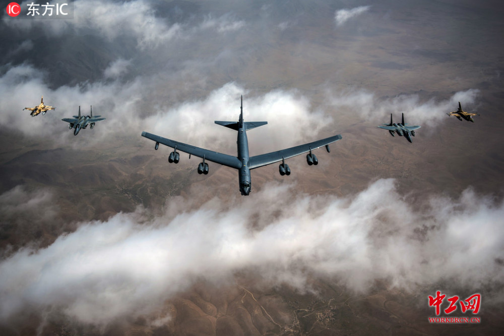 当地时间2018年4月20日,两架美国空军F-15C鹰式战斗机、一架B-52平流层堡垒轰炸机和两架摩洛哥空军F-16战机参加非洲狮演习(Exercise African Lion)。