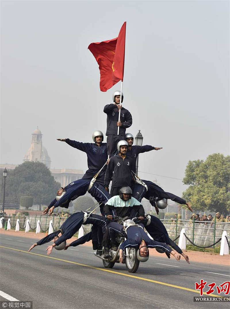 印度士兵参加共和日阅兵彩排 再现摩托车叠罗汉特技