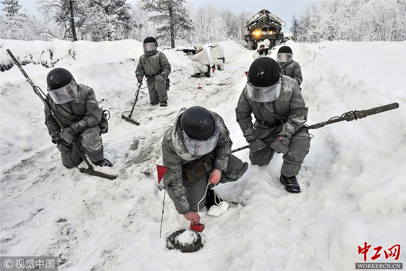 当地时间2019年1月17日,俄罗斯摩尔曼斯克地区,俄罗斯北方舰队海军工程兵团在极端寒冷天气环境下参加训练演习。