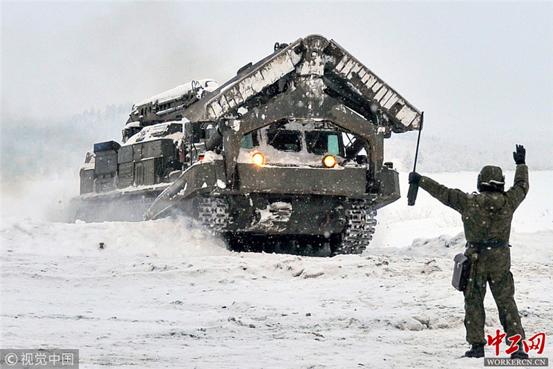 当地时间2019年1月17日,俄罗斯摩尔曼斯克地区,俄罗斯北方舰队海军工程兵团在极端寒冷天气环境下参加训练演习。