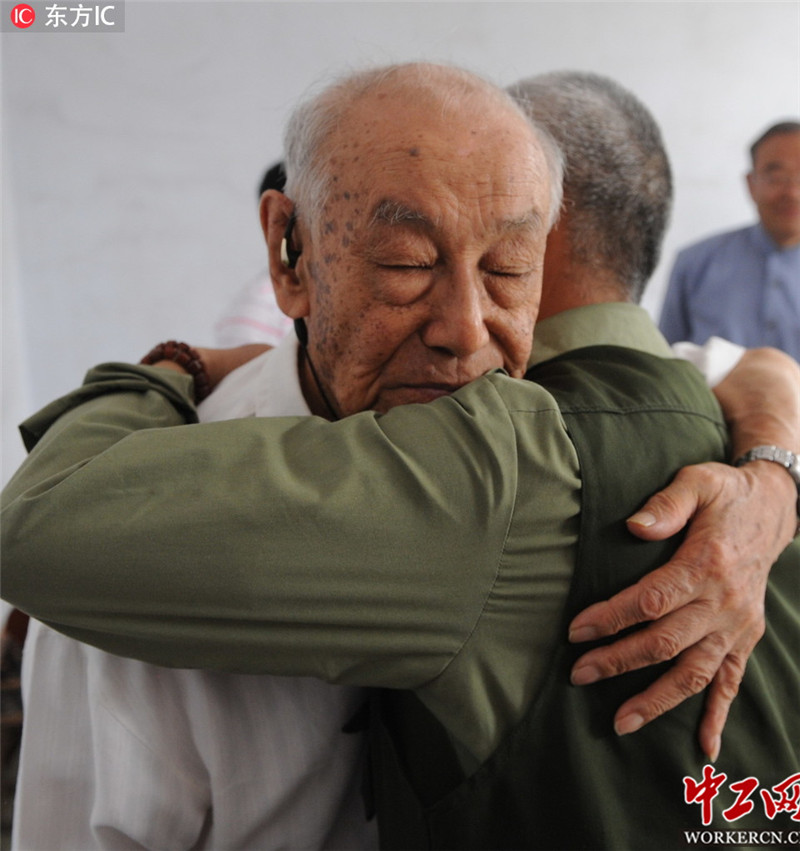图片说明: 2010年6月中旬,山东赤日炎炎,一位来自日本的91岁老人冒着酷暑奔波在鲁中鲁南大地上。这位老人叫小林宽澄,日本八路新四军战友协会会长,当年在华日人反战同盟成员。小林拥抱老房东孩子