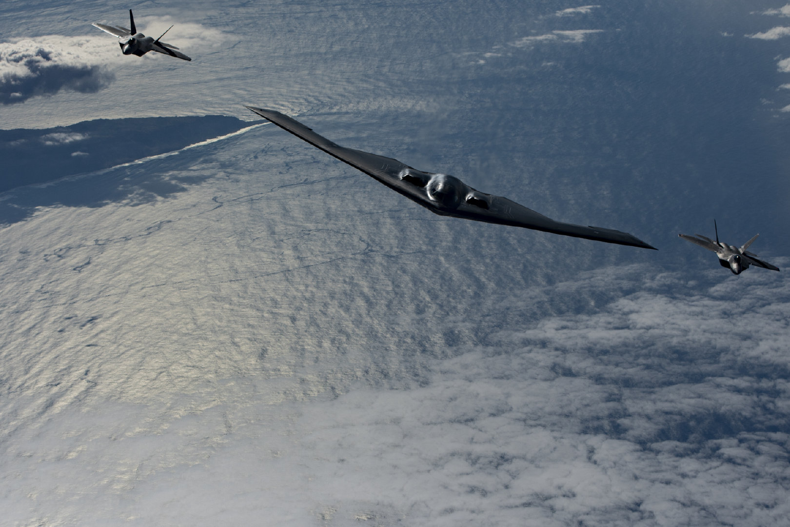 美军F-22护航B-2轰炸机进行空中加油训练