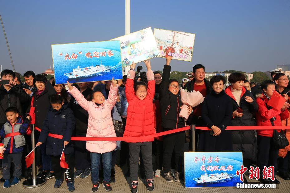 1月18日上午,执行“和谐使命—2018”任务的中国海军和平方舟医院船,圆满完成对巴布亚新几内亚、瓦努阿图、斐济、汤加、委内瑞拉、厄瓜多尔等国的友好访问和医疗服务任务,亮相智利海军成立200周年纪念活动后,顺利返回中国舟山某军港。中国人民解放军东部战区海军领导,官兵家属代表在码头迎接。图为小海娃在码头举牌欢迎。中新社发 史奎吉 摄