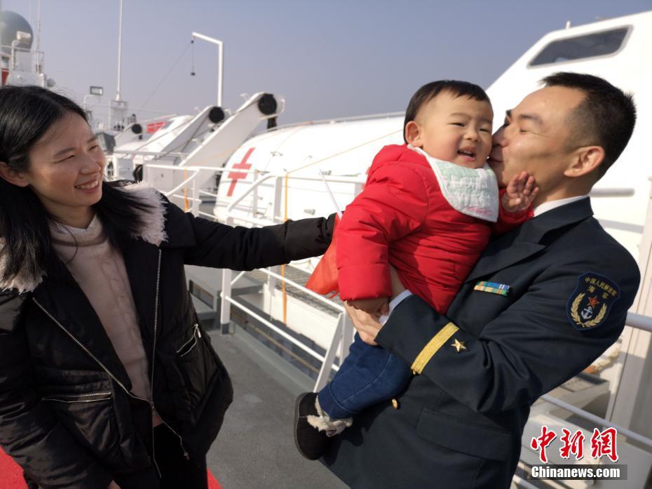 1月18日上午,执行“和谐使命—2018”任务的中国海军和平方舟医院船,圆满完成对巴布亚新几内亚、瓦努阿图、斐济、汤加、委内瑞拉、厄瓜多尔等国的友好访问和医疗服务任务,亮相智利海军成立200周年纪念活动后,顺利返回中国舟山某军港。中国人民解放军东部战区海军领导,官兵家属代表在码头迎接。图为一名小海娃不让父亲亲吻。中新社发 江山 摄