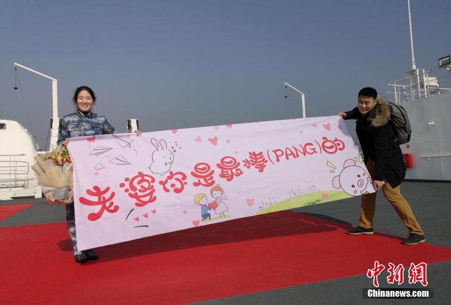 1月18日上午,执行“和谐使命—2018”任务的中国海军和平方舟医院船,圆满完成对巴布亚新几内亚、瓦努阿图、斐济、汤加、委内瑞拉、厄瓜多尔等国的友好访问和医疗服务任务,亮相智利海军成立200周年纪念活动后,顺利返回中国舟山某军港。中国人民解放军东部战区海军领导,官兵家属代表在码头迎接。图为一名远航归来的女军官受到丈夫欢迎,喜笑颜开。中新社发 江山 摄