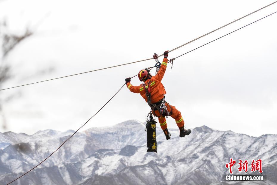 1月17日,西藏消防总队在培训基地进行高山救援实战演练。演练现场,以总队培训基地后山为背景,进行峡谷救援、T型救助、高空横渡V型救援、路绳搭建、单兵上升与下降、悬崖担架陪护上升与下降等多项目的演练。据悉,此次演练是国家高山救援拉萨大队组建以来,西藏消防总队开展的首次高山救援实战演练,共投入8车63人、专业救援装备145余类。图为峡谷救援演练。何蓬磊 摄