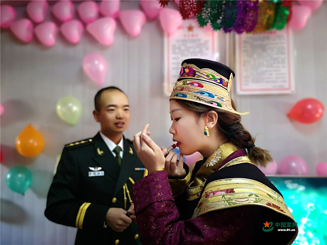 婚礼前,身着当地少数民族服装的王梅精心梳妆打扮。