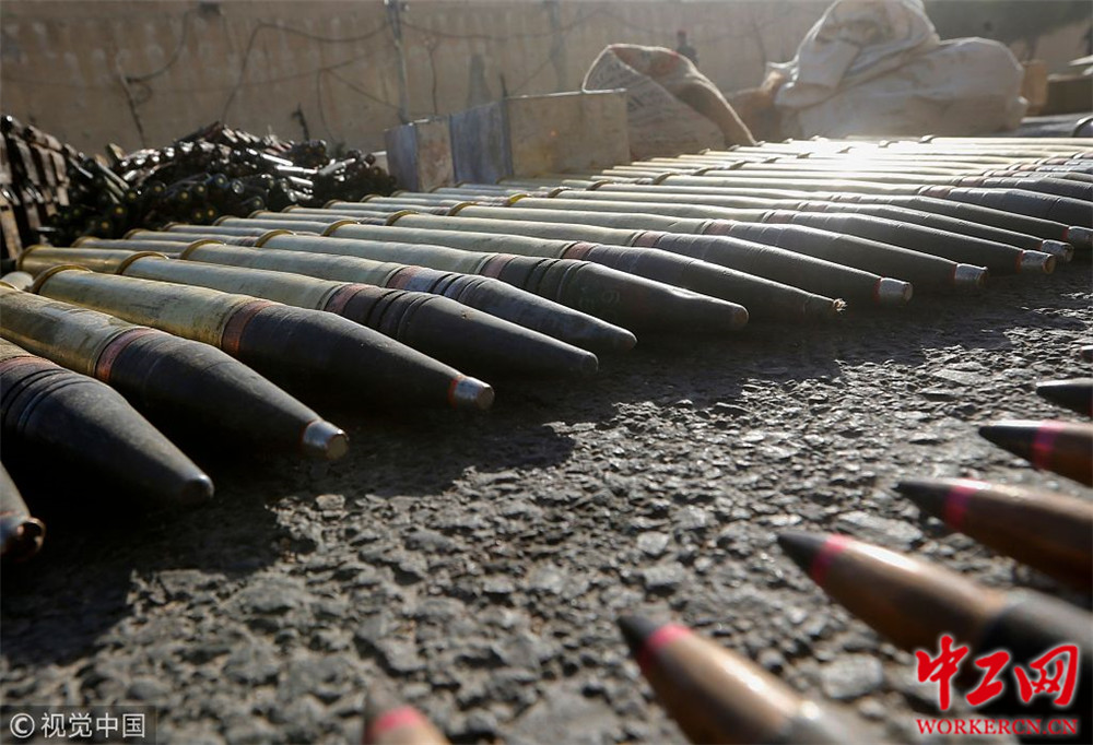 当地时间2019年1月23日,叙利亚大马士革,叙利亚政府缴获的迫击炮弹和武器,据报道,这些武器是由武装反对派组织遗留下来的,在首都大马士革郊外的一个秘密地点陈列。