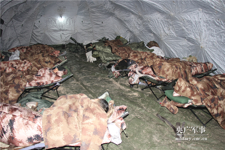 夜晚,官兵们在自己搭设的帐篷内休息。