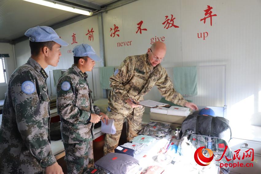 装备核查组人员对维和部队官兵个人装具进行核查(赖晋安 摄)