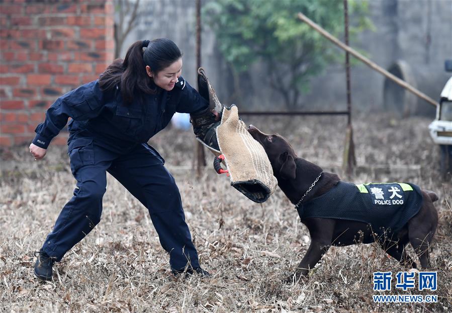 1月25日,在南宁铁路公安局南宁公安处警犬工作队,黄晓莉带着警犬“浩克”进行训练。