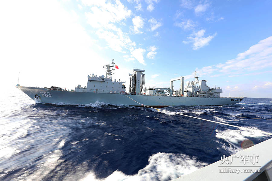 央广网1月26日消息(周启青 周演成 记者谢芳)近日,南部战区海军远海联合训练编队在西太平洋进行综合补给演练。参与此次补给演练的共有四艘舰艇,其中长白山舰担负警戒任务,洪湖舰作为综合补给舰,对合肥舰和运城舰进行补给。