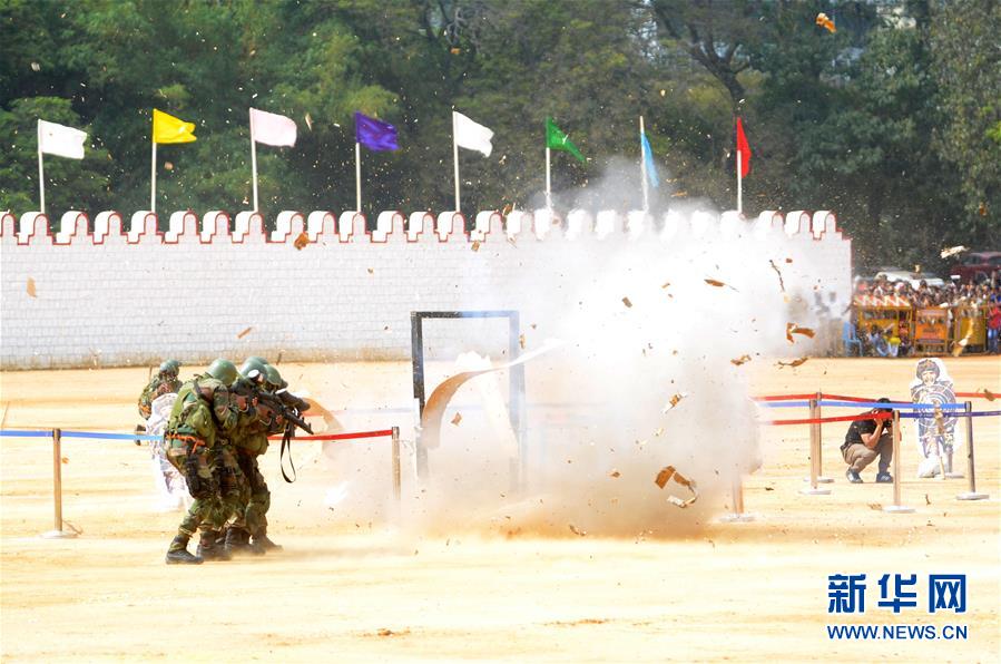 1月26日,在印度班加罗尔,印度士兵在共和国日庆典上展示技能。 印度各地26日举行庆典,庆祝第70个共和国日。 新华社发