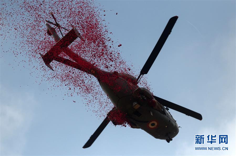 1月26日,在印度班加罗尔,直升机在共和国日庆典上洒下花瓣。 印度各地26日举行庆典,庆祝第70个共和国日。 新华社发