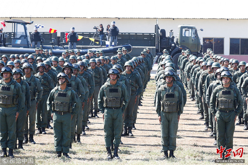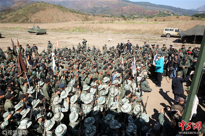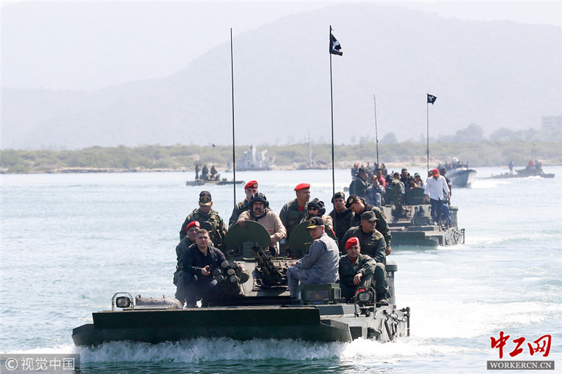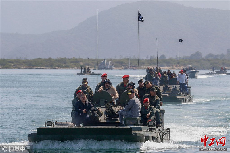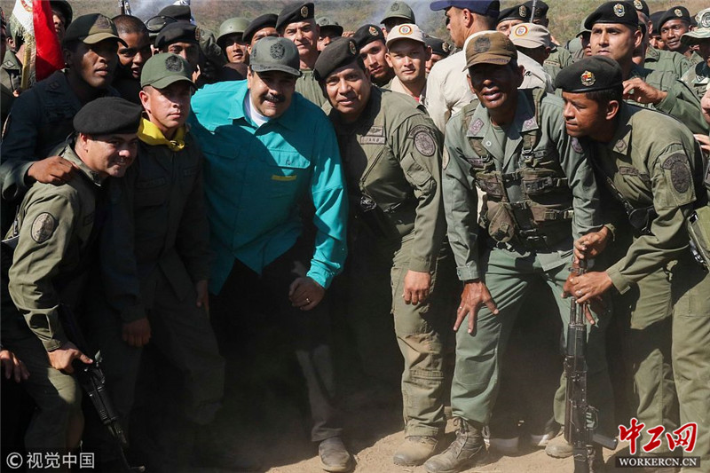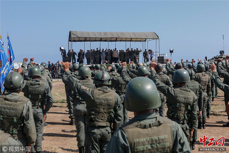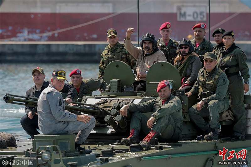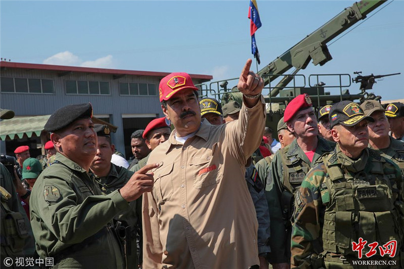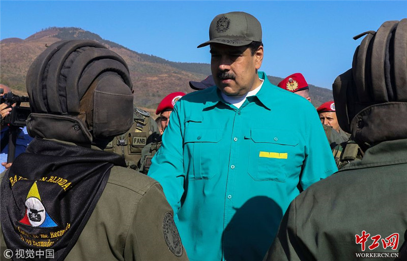 当地时间2019年1月27日,委内瑞拉卡拉博沃州naguanagua,委内瑞拉总统马杜罗出席当地军事演习。马杜罗已经明确拒绝了英法德等欧盟国家的最后通牒——要求委内瑞拉8天内重新大选。