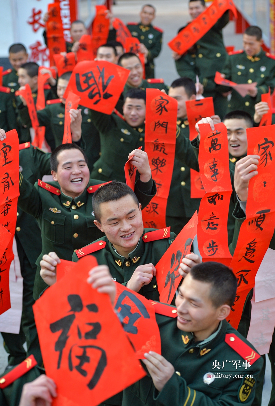官兵展示自己写的春联、“福”字。侯崇慧摄