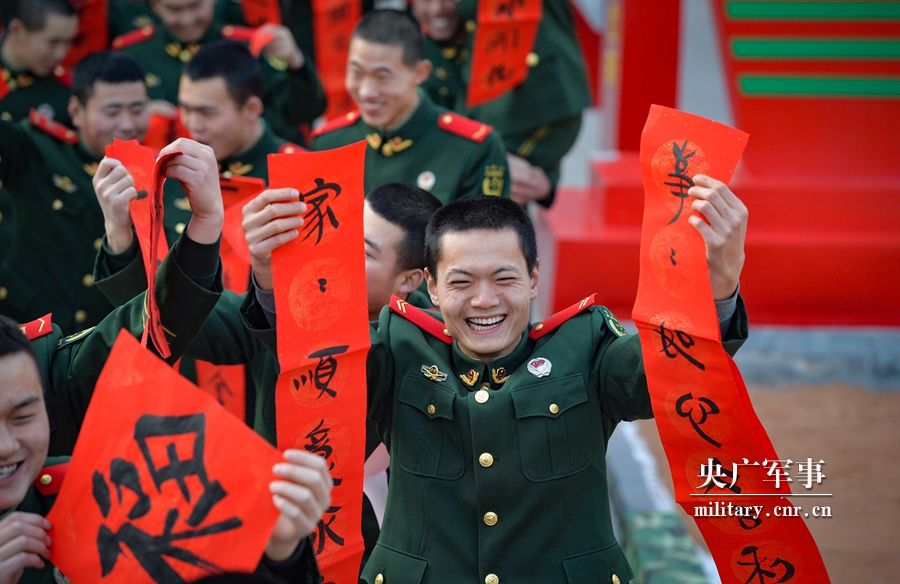 官兵开心展示自己手中的“福”字。侯崇慧摄