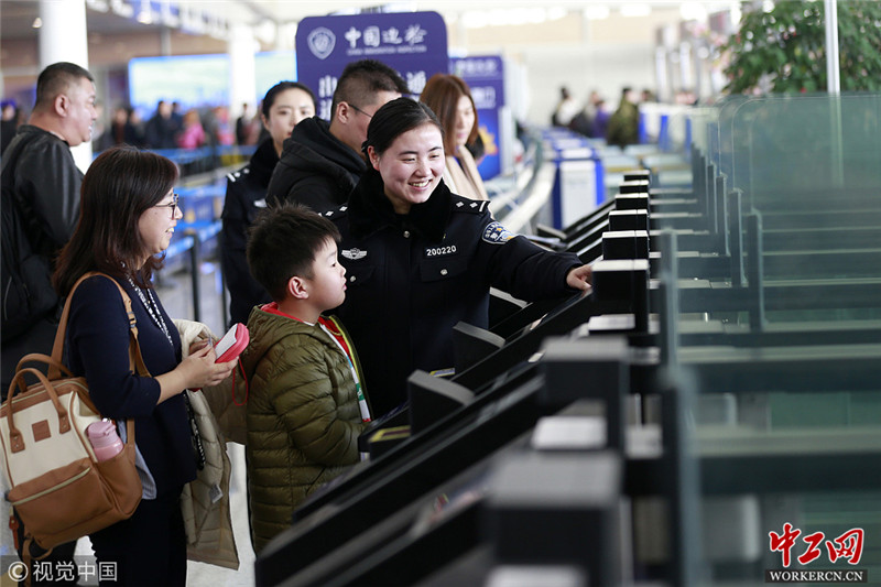 2019年1月28日,南京,江苏南京出入境边防检查站女警张莹莹在指导旅客使用出入境自助通道。