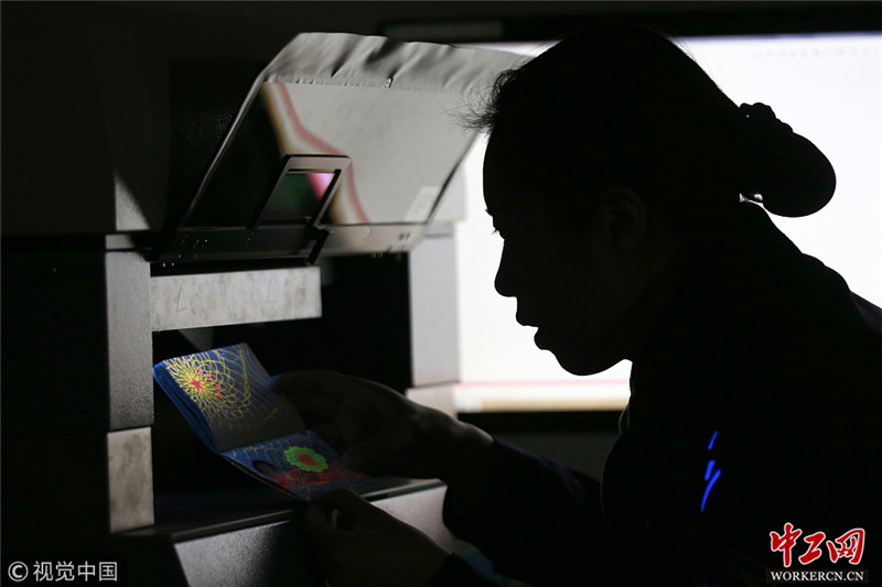 2019年1月27日夜里,南京,由于一名旅客证件出现异样,范一在仪器下认真辨别其真伪。在日常生活中,下勤后的加班加点也是常有的事。