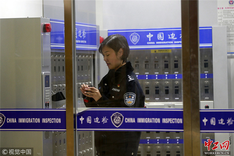 2019年1月27日,江苏南京出入境边防检查站女警顾敏媛在上勤前再次确认验讫章信息。