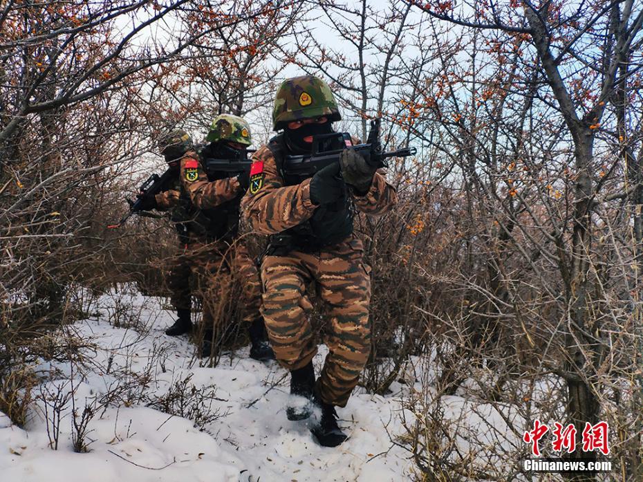 1月底,武警甘肃总队甘南支队特战分队在零下23℃寒冬天气集训。该支队以甘南高原独特天候为契机,精心组织端黑窝子、高层楼房反劫持、山地武装奔袭等18项课目训练,在严格训练中培养特战队员,锻造陇原高原特战利剑队伍。图为武警官兵在密林丛中锤炼战术协同配合。张颖 摄