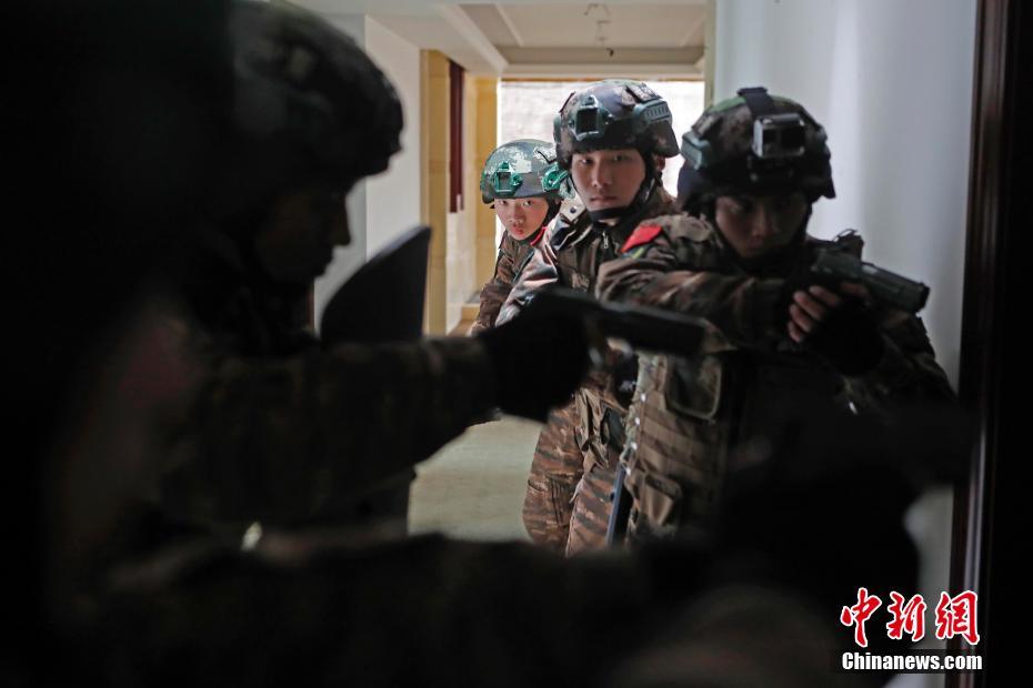 2月12日,一场反劫持演练在上海浦东张江高科某会所打响。武警上海总队执勤二支队针对反恐处突任务实际,让特战队员在类似实战环境中经受历练,锤炼反恐处突硬功。图为突击队员对某会所进行突击进攻。殷立勤 摄