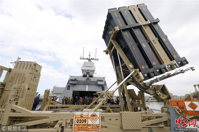当地时间2019年2月12日,以色列海法北部港口,以色列海军舰队Sa'ar 5 Lahav级护卫舰安装铁穹防御系统,用于拦截和摧毁来袭的短程火箭和炮弹,以色列总理内塔尼亚胡亲自视察。