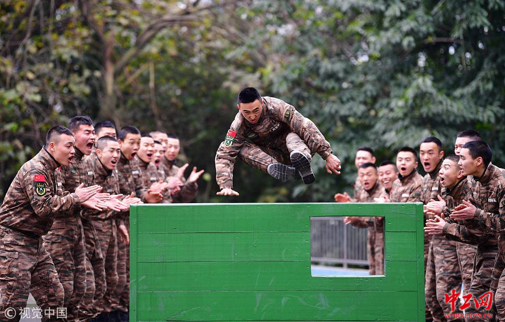 2019年2月14日,在武警重庆总队执勤第二支队机动中队训练场,官兵们正在进行器械对抗训练。