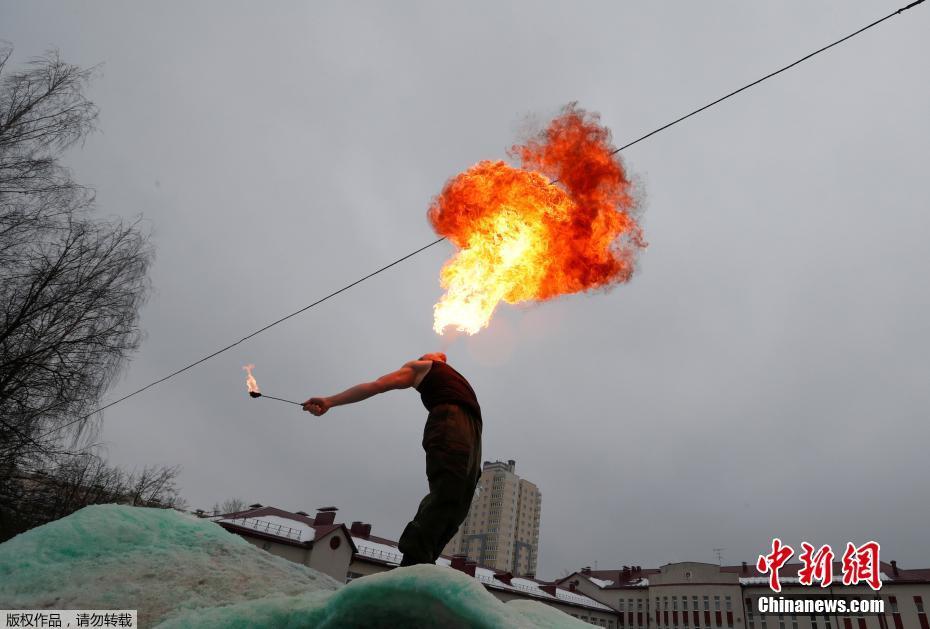 当地时间2月17日,白俄罗斯明斯克,白俄罗斯内政部特种部队基地举行“冬季趣味”活动,士兵们纷纷表演喷火、胸口碎大石等绝技并与观看表演的家属和民众联欢。图为士兵表演喷火。
