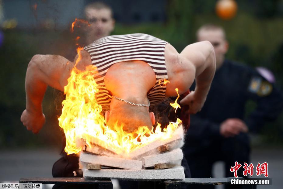 白俄罗斯特种部队士兵表演喷火胸口碎大石