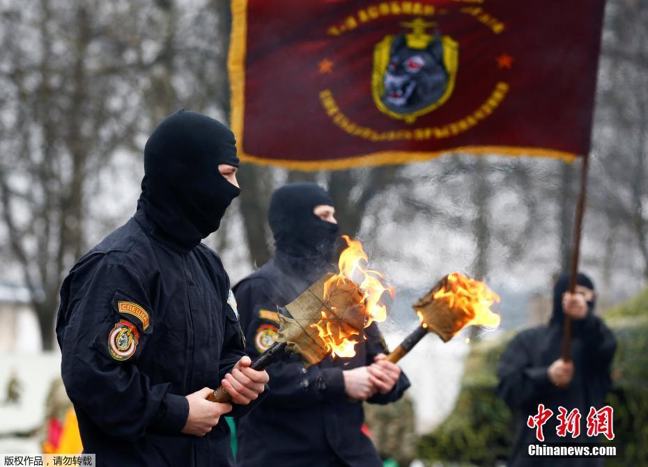 当地时间2月17日,白俄罗斯明斯克,白俄罗斯内政部特种部队基地举行“冬季趣味”活动,士兵们纷纷表演喷火、胸口碎大石等绝技并与观看表演的家属和民众联欢。图为士兵进行燃烧弹使用演示。