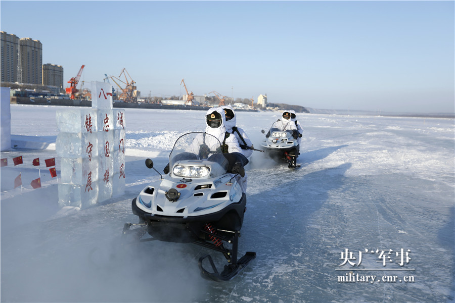 元宵节清晨,官兵驾驶摩托雪撬在界江上巡逻。