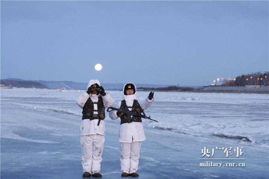 正月十五元宵节清晨,两名“黑河好八连”官兵头顶明月正在界江进行执勤站岗。