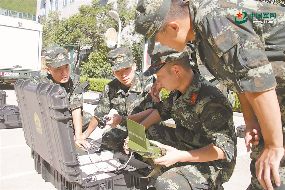 2018年9月7日,王成龙(左一)同战友一起学习装备操作技能。