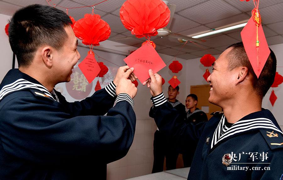 2月19日,东部战区海军某基地教导大队官兵饶有兴趣猜灯谜。刘勇摄