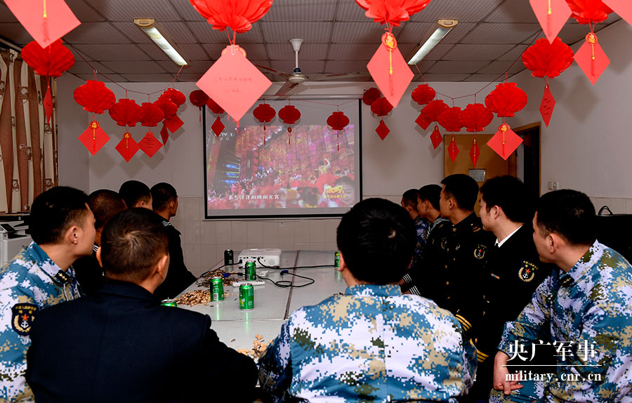 2月19日,东部战区海军某基地教导大队官兵围坐在一起,集体观看元宵晚会。刘勇摄
