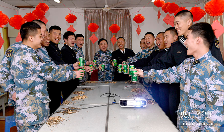 2月19日,东部战区海军某基地教导大队官兵为友谊干杯,为明天加油。刘勇摄