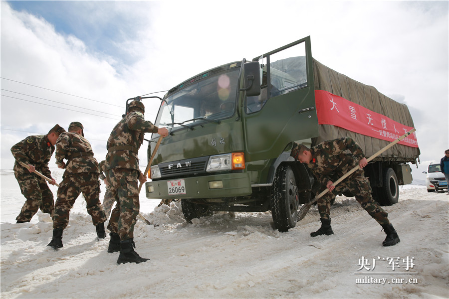 武警青海总队慰问队战士麻启智告诉记者:这里的风估计有六级左右,官兵的手被冻得铁锹把也抓不住。车辆压过,道路上的积雪结成冰了,铲起来特别硬,难度也很大。